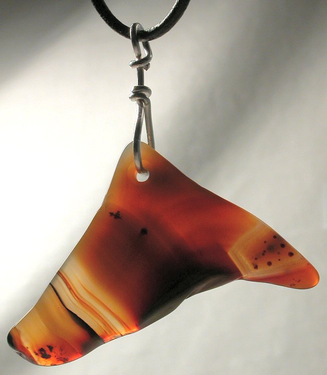View 2 View 3 Carnelian smoke chalcedony agate pendant amazing natural reds and oranges sterling silver setting powerful shamanic energy adjustable leather necklace included 27 x 11 x 10 mm item # carnelpend7 $139.99 SOLD |